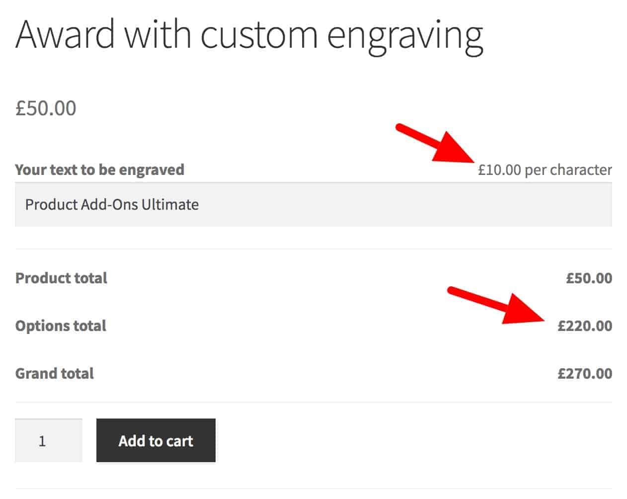 To add a cost for the engraving, just enter the value in the ‘Field Price’ field. This will be displayed on the front end. When the user enters some text into the field, the extra cost will be added to the product price.